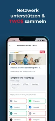 Mit der two.jobs App kannst Du ganz einfach spannende Stellen mit deinem Netzwerk teilen. Gleichzeitig sammelst Du TWO$ mit denen Du im Shop interessante Produkte und Rabatte kaufen kannst.