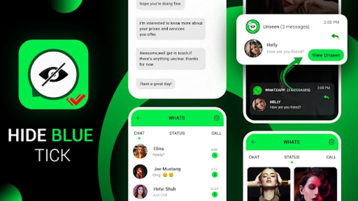 Unseen - Hide Blue Tick is an incognito app that hides your Whats Plus Read Receipts, Blue Double Tick, Check Marks, and Last Seen. No one will know that you have already read messages or chats. If you don't want others to know that you have read their messages then Unseen - Hide Blue Tick is a great app for you.