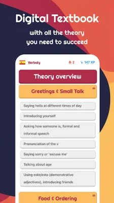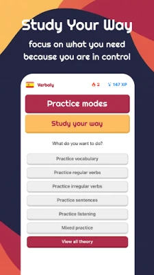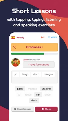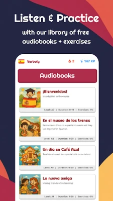 Our app offers interactive lessons with audio from native speakers so you can practice correct pronunciation and intonation. Whether you're a beginner or looking to improve your existing skills, Verboly adapts to your level. You can easily track your progress, and the app helps you review words or phrases that need extra practice.