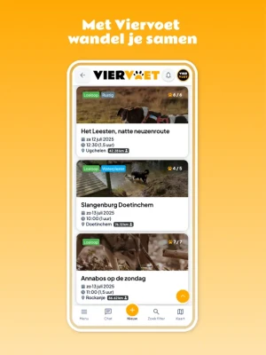 Welkom bij ViervoetDe honden app voor jou en je hond, waar wandelen, ontdekken en verbinden samenkomen. Of je nu houdt van lange hondenwandelingen, nieuwe hondvriendelijke wandelroutes wilt verkennen of graag contact hebt met andere hondenliefhebbers, met Viervoet heb je de hondenwereld in je zak.