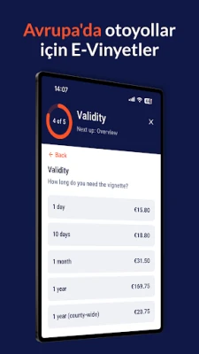 Elektronik vinyetler, otoyol cihazı, ve yol yardımı – hepsi tek bir uygulamada.