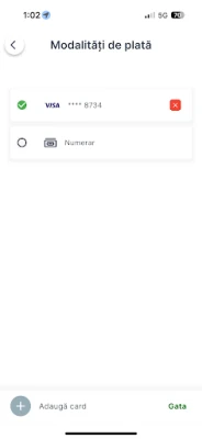 - Alege între plată cu cardul direct în aplicație sau numerar.