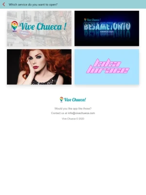 Vive Chueca is a multi-service app. From Vive Chueca, you can also access - The Besametonto Awards, the craziest LGTBI awards from Spain. - Kika Lorace, the successful spanish drag queen well known for the popular song: "Chueca es Genial". - Supremme de Luxe, the famous and glamorous drag singer-songwriter from Madrid. And soon, even more exclusive services...