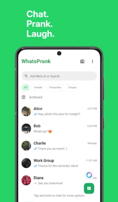 WhatsPrank is for entertainment purposes only. It is not a messaging service and cannot send real messages. It only creates fake screenshots. Use responsibly for harmless fun and avoid misuse.