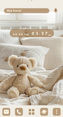 A theme featuring a relaxing wallpaper of a teddy bear plushie and bedroom, along with simple flat icons and widgets that can be customized.