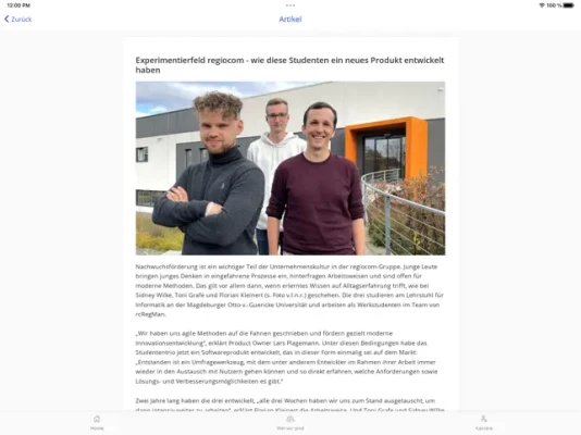 Interessierte können sich in der App jederzeit über das Unternehmen informieren und austauschen. Features rund um E-Learnings, Karrieremöglichketen, Standortnews, Weiterbildung und Gesundheitsmanagement sorgen dafür, dass Ihr immer auf dem Laufenden seid. Jetzt herunterladen und eintauchen in die regiocom Welt.