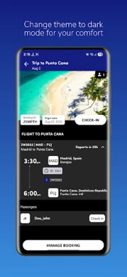 - Notificaciones opcionales para embarque, facturación móvil y antes de volar para viajes cargados en la app.
