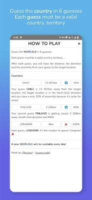 Worldle is a new word puzzle game focused on your knowledge of geography. In Worldle, you have six chances to find a mysterious geographic location. It can be a country, an island, or a territory. You will receive clues about the proximity of each of your guesses. Hints will show you the direction and distance at which you should search for the target area.