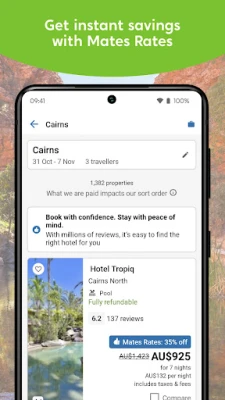 Our mates get instant travel discounts on selected hotels, flights, car hire, activities and more. Sign in on the app and save 10% or more on over 100,000 hotels worldwide with Mates Rates, plus up to 35% when adding select hotels to your flight.