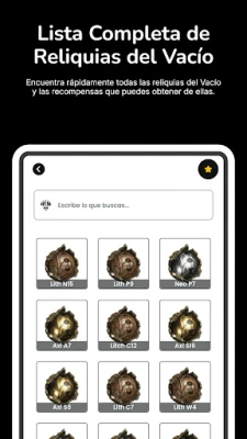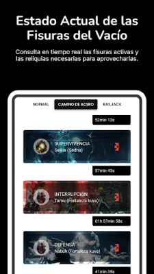 • Baro Ki'Teer: Consulta su inventario actual y la próxima llegada. • Warframes: Accede a una lista completa de Warframes con sus habilidades y estadísticas. • Reliquias del Vacío: Encuentra rápidamente las reliquias y recompensas que necesitas. • Fisuras del Vacío: Información en tiempo real sobre las fisuras activas y recompensas. • Noticias: Mantente informado con las últimas actualizaciones y eventos del juego. • Prime Access: Consulta las ofertas actuales de Prime Access y sus ventajas exclusivas.