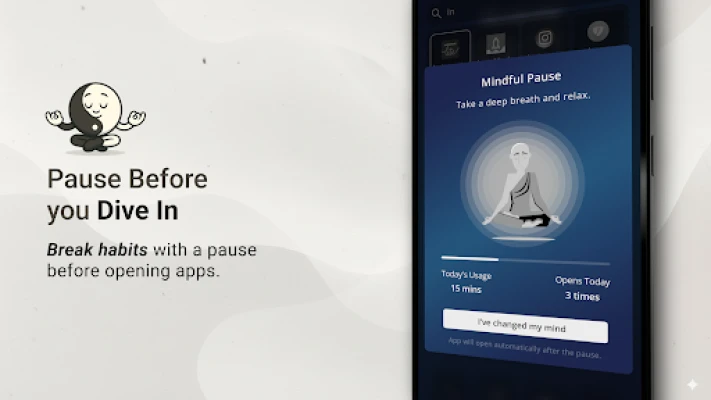 • Mindful Pause: A calming breath animation adds soft friction before distracting apps, breaking unconscious habits without restrictions.