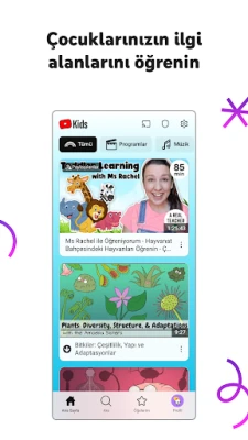 Çocuklar için tasarlanan uygulamada, çocuklarınızın hem kendilerine hem de ailelere hitap eden video içerikleri keşfetmesine yardımcı olun. Kolayca kullanılabilen gezinme araçları ve çeşitli özellikler sayesinde, çocuklarınız internette yeni ilgi alanları keşfederken hayal güçlerini besleyebilir ve öz güven kazanabilir.