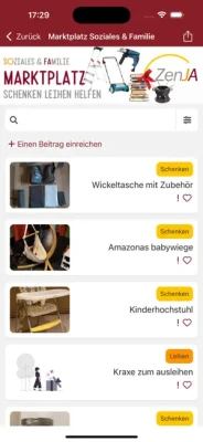 Eine Herzenssache ist auch der Marktplatz für Soziales & Familie (SoFa-Marktplatz). Damit wollen wir das nachbarschaftliche Miteinander anregen und Jung & Alt zum Teilen, Schenken, Leihen und Helfen anregen. Da wird z. B. ein Fondue-Topf zum Ausleihen für eine Familienfeier gesucht, jemand hat ein Fahrrad oder Einmachgläser zu verschenken, es können im Garten Pflanzen geteilt werden oder jemand braucht Hilfe. Der SoFa-Marktplatz soll wie das klassische schwarze Brett funktionieren - nach dem Motto "Wer sucht, findet".