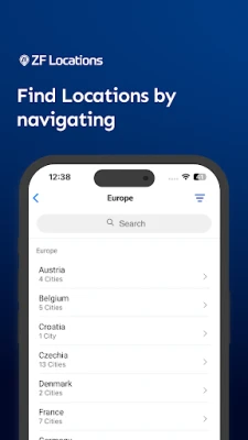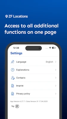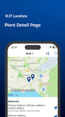 The ZF Locations App provides an overview of all ZF locations worldwide. It is easy to find the locations via an intuitive list and map navigation. The detailed view of a location offers the location’s address, contact information and, if available, directions and location plans. Individual locations can be displayed on a map using geolocation. It is possible to start navigation to the location immediately. The app does not need a data connection. Only the location indicator on the navigation map requires a mobile data connection. Supported devices are iPhones, iPads and iPods. Supported languages are English and German.