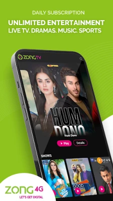 Application features • 40+ Live TV Channels • Watch & Record your favorite shows simultaneously • Uninterrupted Streaming of High-Quality Video with adaptive streaming • Rewind Play Back feature lets you watch 7 days of missed show recordings on Live TV channels • User-friendly Intuitive Interface • Picture-in-Picture mode lets you do other tasks on your phone while streaming on Zong TV • On-screen Player Controls • 24 x 7 Connectivity